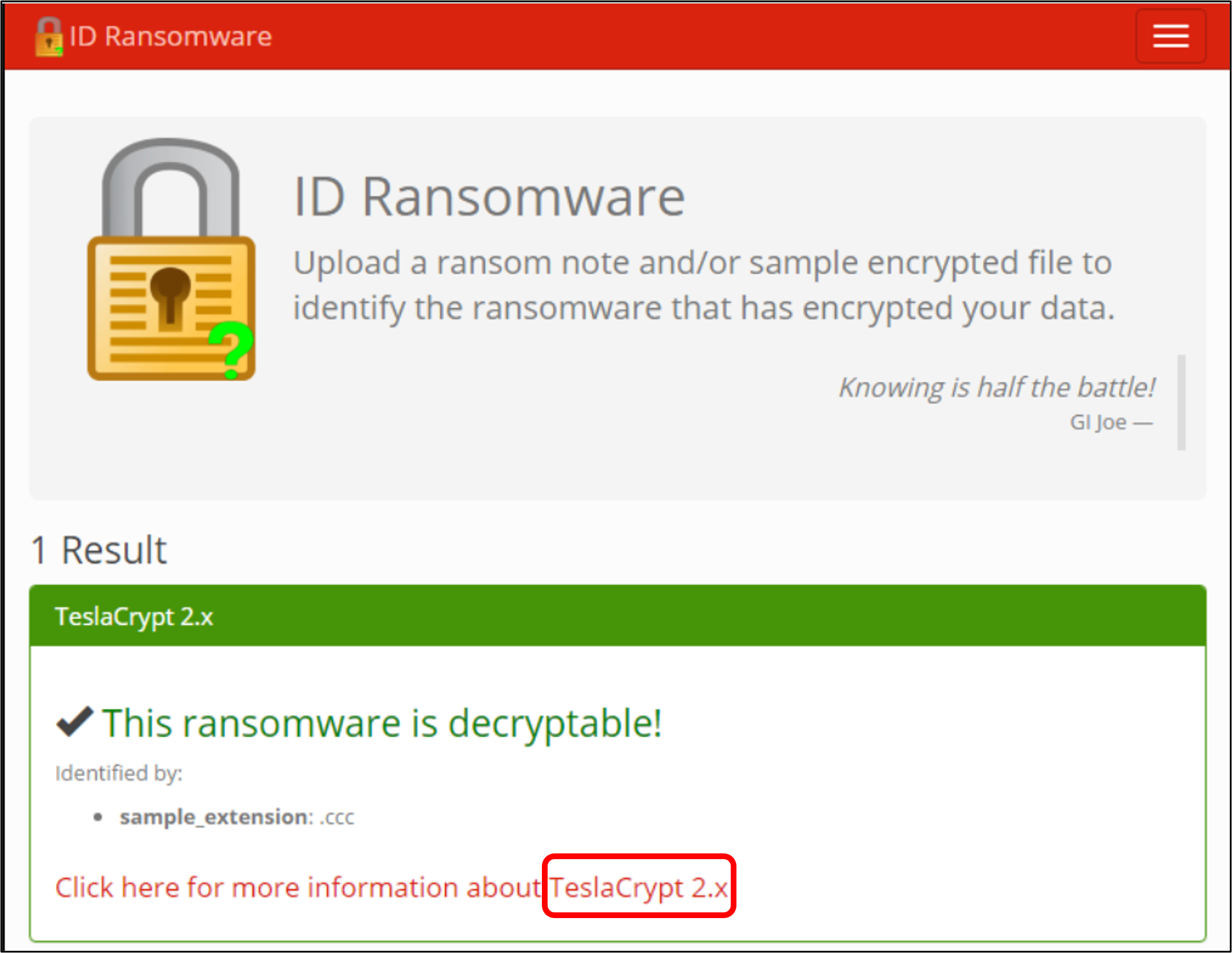圖2、ID Ransomware 勒索軟體名稱的辨識結果示意圖(紅框處)