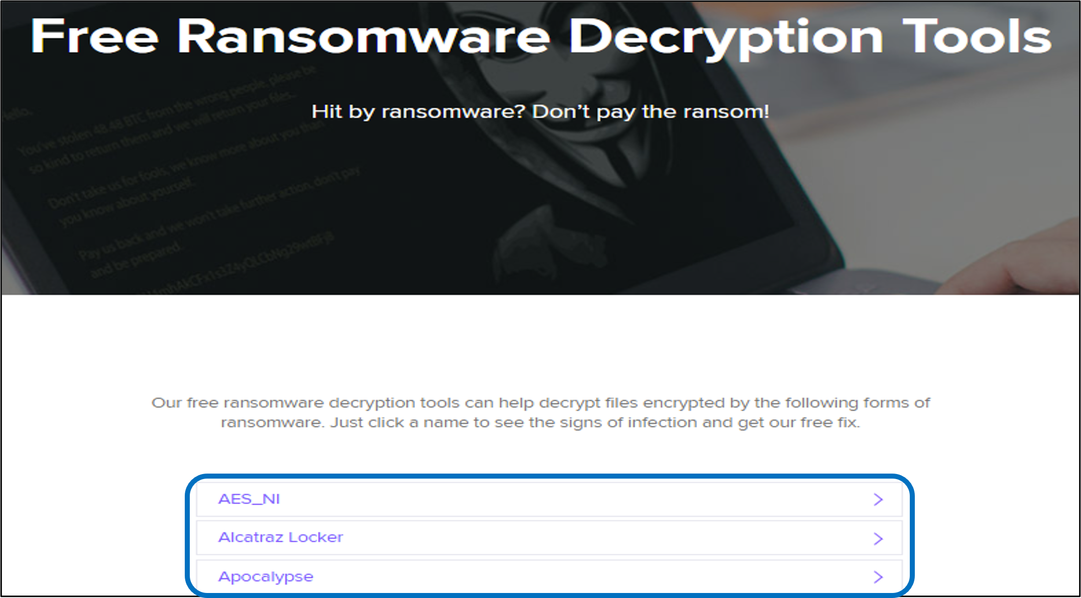 勒索軟體透過資料加密等手法要脅受害者,要求支付贖金以取回受加密的資料。目前防毒軟體廠商針對部分勒索軟體提供免費解密工具,本篇第二章節提供線上勒索軟體辨識服務,協助辨識勒索軟體之名稱。本篇第三章節整理了解密工具清單,使用者可於辨識服務網頁中搜尋勒索軟體名稱找到對應的解密工具,少數勒索軟體有機會使用這些工具嘗試解密。
