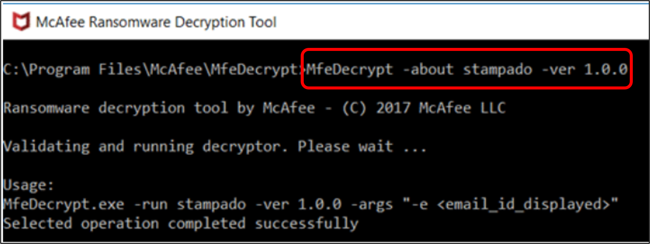 (c) 執行 ‘MfeDecrypt -about stampado -ver 1.0.0’指令查看解密工具使用方式(圖18紅框處)。