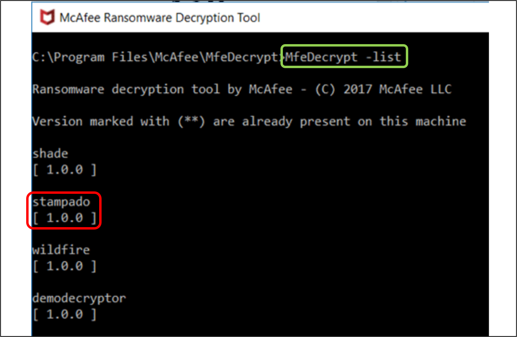 (a) 啟動Mr2後,輸入 ‘MfeDecrypt -list’指令(圖16綠框處)搜尋 ‘Stampado’勒索軟體的解密工具(圖16紅框處)