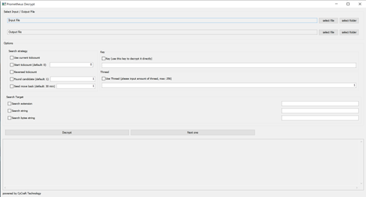 由奧義智慧提供。使用者可以下載安裝奧義提供的Windows版本解密工具,根據電腦的環境選擇不同的位元並執行,可以解開被Prometheus勒索軟體加密的檔案。解密工具如圖24所示。
