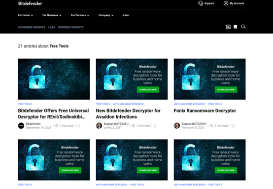 由Bitdefender提供。使用者可以瀏覽Bitdefender網站,查看是否有可以使用的解密工具如圖25,在進入勒索軟體的分享文章後,可以下載勒索軟體解密工具如圖26。