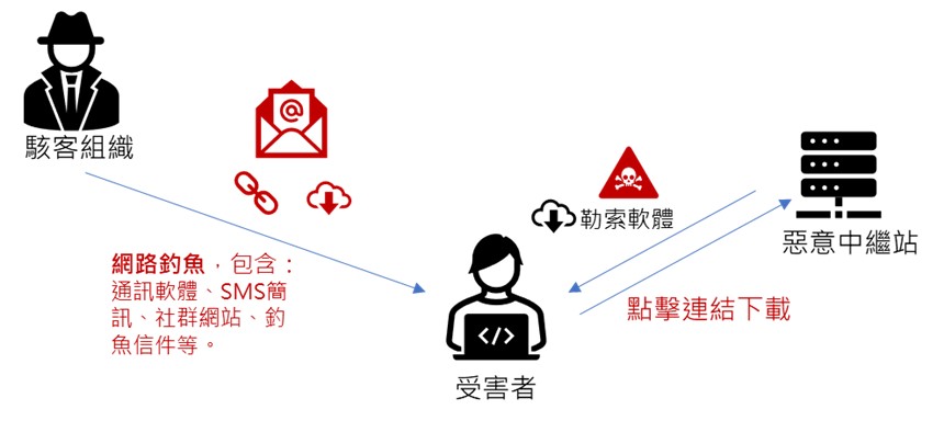 網路釣魚是傳遞勒索軟體最常見的方式,類似的方式有很多,包含:通訊軟體、SMS簡訊、社群網站、釣魚信件等。其中,釣魚信件是經常被使用的方式,攻擊者通常會將惡意連結或附檔透過社交工程的方式寄送到受害者的信箱,當受害者開啟信件中的惡意連結或附檔時,就會下載並執行惡意程式。