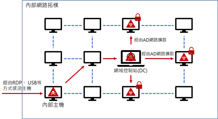勒索軟體在感染公司或組織內部主機後,會滲透企業或組織網路並在內部散播,企業或組織必須具備足夠的網路能見度來主動回應或控制這些威脅所造成的影響,並減少重複感染的風險。當攻擊者進入公司內部後,通常以網域控制站 (Domain Controller, DC)為目標並將其當作傳播勒索軟體的中轉站。攻擊者在取得AD網路的控制權後,可以將勒索軟體散播至AD網路中所有的主機,資產損害的程度也大為提升。在資訊安全防禦的策略中,當攻擊事件發生時,應啟動資安事件應變計畫,並即時掌控資安影響範圍,藉此阻斷資安損害的範圍。當企業內部已遭勒索軟體入侵,為避免其他主機或重要資產遭到勒索軟體加密和外洩,應立即阻斷勒索軟體在內部網路擴散的路徑,實行斷網、隔離等防護措施。