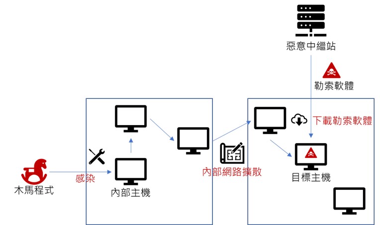圖3:前驅惡意程式透過漏洞、網路釣魚等方式進入內部網路進行擴散