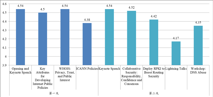 參與本次活動之滿意度調查中,其滿意度數據高達4.49/5,並且滿意度以第一天之Opening and Keynote Speech、WHOIS: Privacy, Trust, and Public Interest、第二天之Keynote Speech為最高,如下圖: