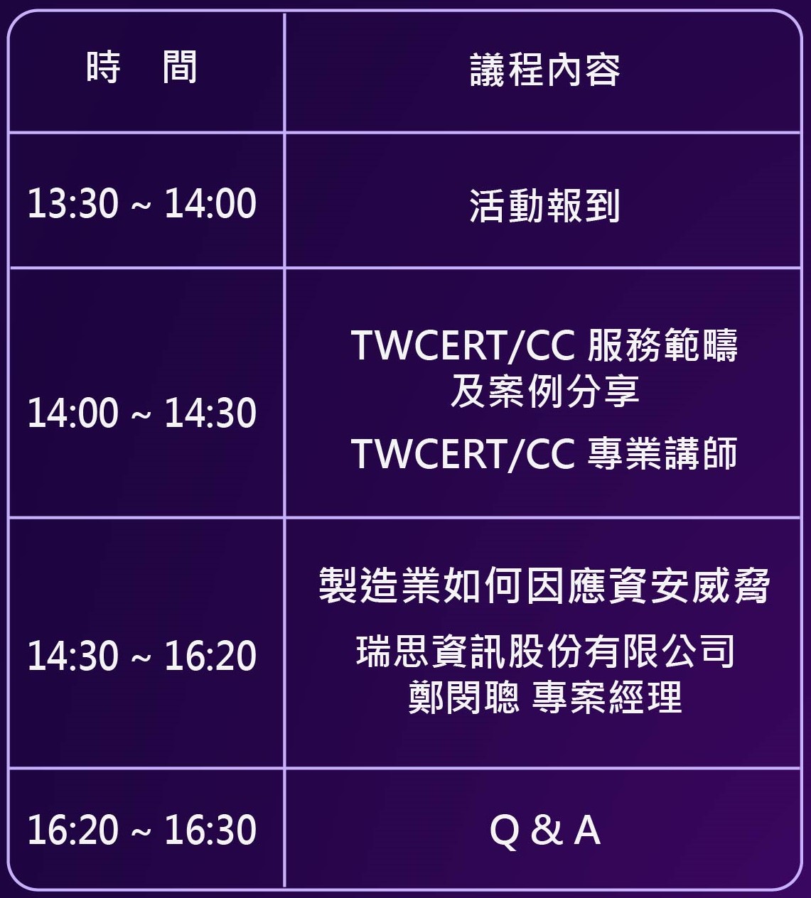 | 14:00~14:30 | TWCERT/CC服務範疇及案例分享 TWCERT/CC講師 |