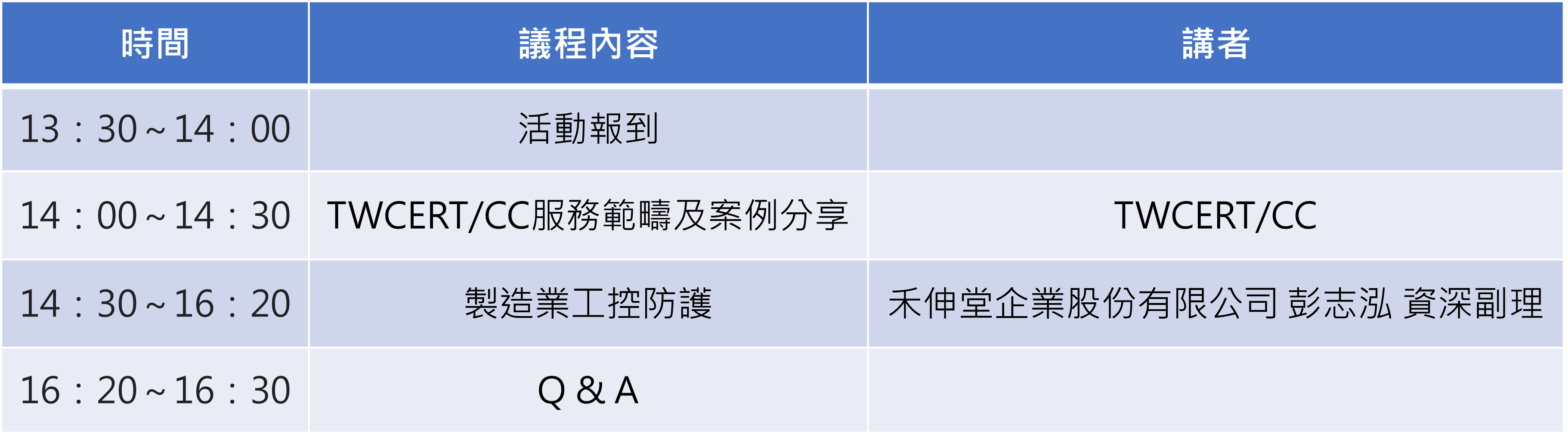 | 14:00~14:30 | TWCERT/CC服務範疇及案例分享 | TWCERT/CC講師 |