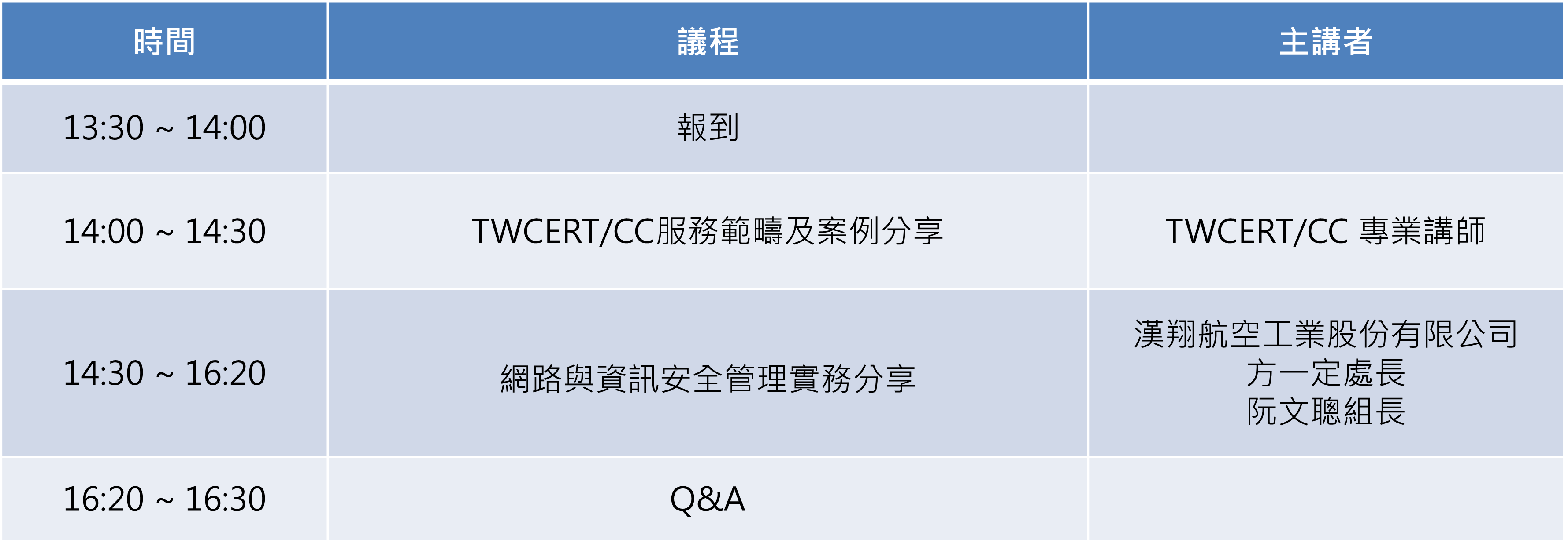 | 13:00~13:25 | 網路與資訊安全管理實務分享 | 漢翔航空工業股份有限公司 方一定處長 阮文聰組長 |