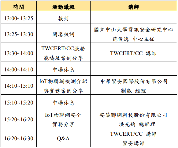 | 16:20~16:30 | Q&A | TWCERT/CC講師 資安講師 |